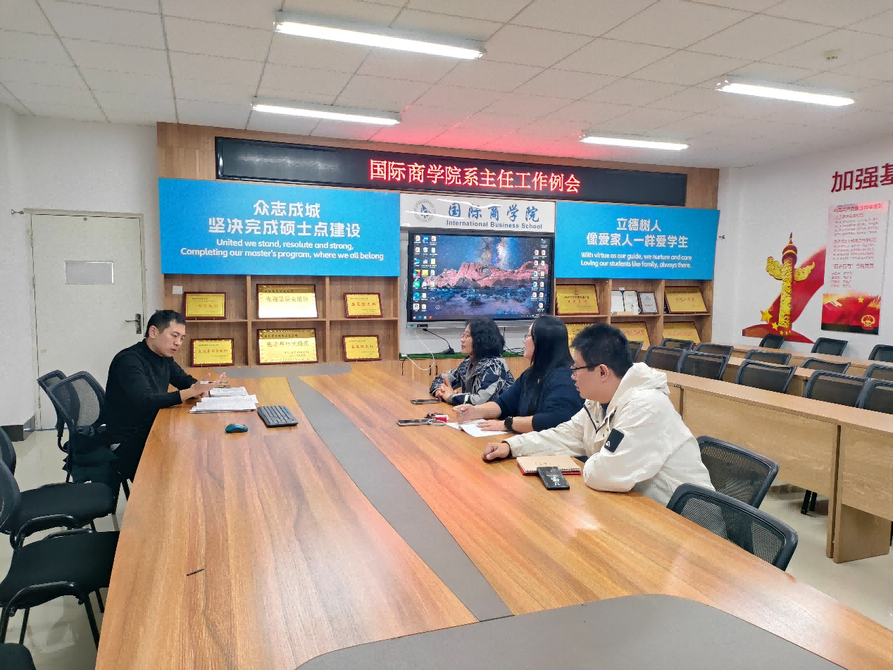 为切实落实新一轮本科教育教学审核预评估整改要求,全面提升教学管理规范化水平,10月22日下午,国际商学院在学院会议室B410召开系主任工作例会。会议由国际商学院副院长王岩主持,各系主任参加会议。