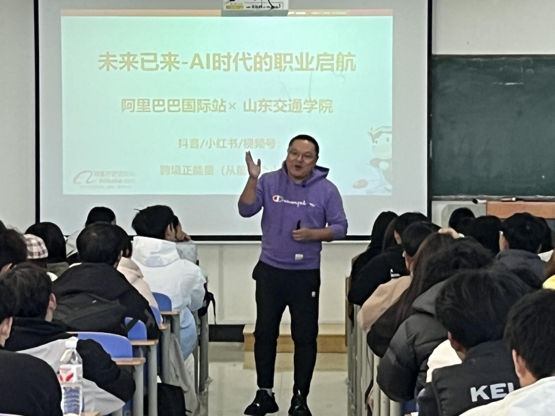 10 月 23 日,电子商务系邀请阿里巴巴国际站(威海)运营总监周世杰,为电商 251-2、商职 251 班共 124 名学生,作题为《未来已来-AI时代的职业启航》的专题讲座。周世杰总监从阿里巴巴集团概况切入,逐步介绍了阿里巴巴国际站(威海)的主营业务、企业文化及发展现状,并结合自身从业经历,为处于大学第一学期的学生们,提供了生动鲜活的电商企业实际案例,让专业课学习与行业实践紧密结合。