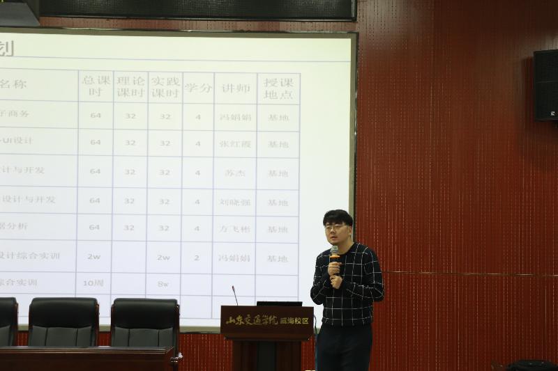 首先,由青岛青软实训教育科技股份有限公司韩涛总经理讲述赴企业学习阶段教学工作安排,他简单介绍了青岛基地的情况以及同学们的学期目标,分析了同学们赴企业学习的优势,强调了从电商专业发展趋势,理论学习与实践学习的重要性,也分析了同学们的就业情况。最后,孙龙老师作总结,表达了同学们赴企业学习的决心,希望同学们能够在新的学习环境中学会适应与改变,为学院争光。