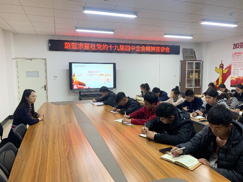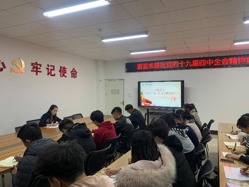 12月11日,蔚蓝求是社在学院会议室召开党的十九届四中全会精神宣讲会,蔚蓝求是社全体成员参加,辅导员陈凌愿主持会议。