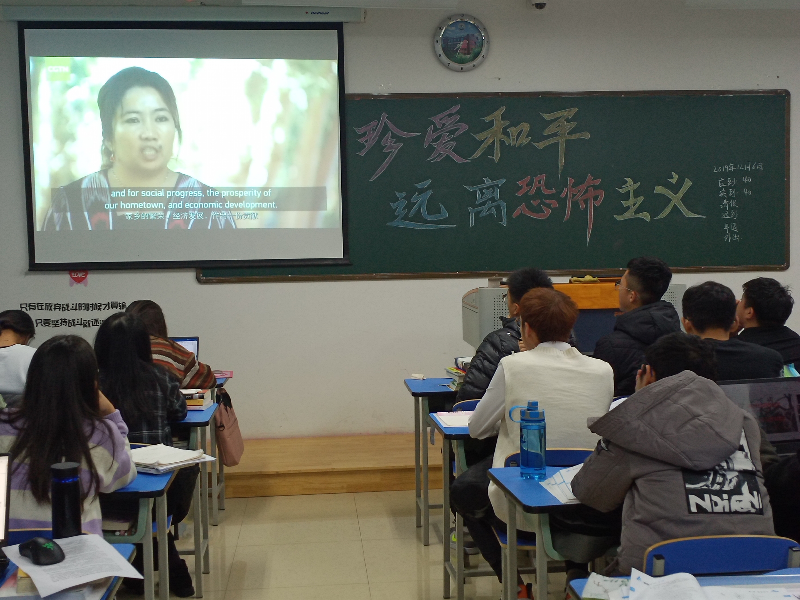 为了提高学生的安全防范意识,珍惜和平稳定的生活环境,提高抵抗不良诱惑的能力,增强辨别恐怖主义的眼力,12月8日,国际商学院全体学生在辅导员王旭、陈凌愿的带领下,观看了由共青团中央发布的纪录片:《中国新疆反恐前沿》。