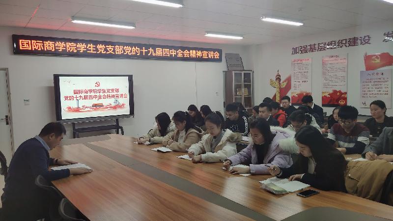 12月6日,我院在B410党员活动室开展学习十九届四中全会精神宣讲会,会议由我院辅导员王旭老师主持,全体学生党员参加。