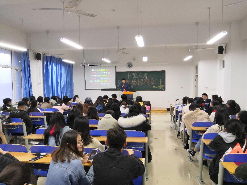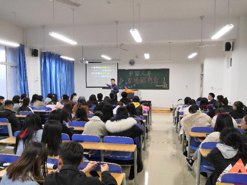 11月15日,我院在2号教学楼召开中国人寿专场招聘会,此次招聘会由中国人寿保险威海分公司讲师宋经理主讲,我院17级旅游管理专业学生参加招聘会。