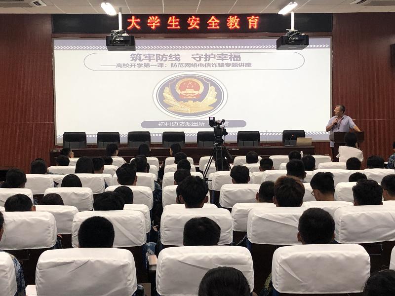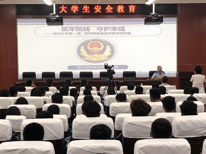 首先刘警官播放了多个网络诈骗电影片段,列举高校诈骗案真实案例,让大家了解网络诈骗的内幕,他指出,大学生防盗防骗意识淡薄,容易轻信他人,导致钱财损失,人身安全遭到威胁的现状。同时,刘警官还向新生们简单介绍了窃贼偷盗的惯用伎俩,希望新生们注意宿舍和外出防盗,时刻保持警惕,不轻易相信陌生人。最后,张老师提出:希望新生们能够用实际行动,真正做到遵纪守法,掌握防火、防盗、防骗、交通安全自救知识,做一名文明、健康、有为、诚信的大学生。