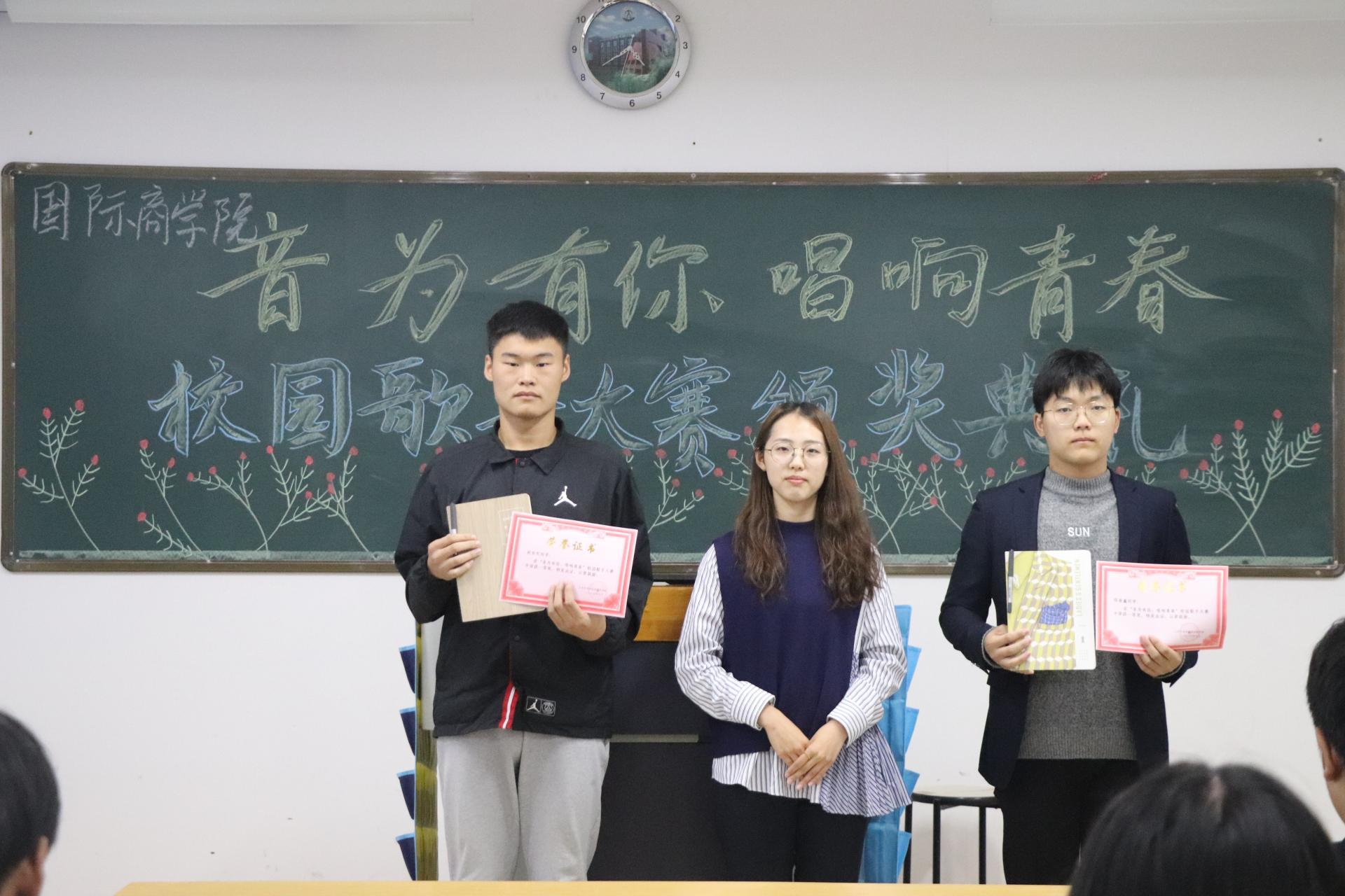 本次大赛经过评委老师打分、评选,共有11名同学脱颖而出。典礼伊始,陈老师对获奖同学表达了真诚的祝贺。她指出,本次校园歌唱大赛丰富了同学们的课余生活,为我院学子提供了一个展示自我的舞台。随后,陈老师依次向获奖同学颁发奖品和荣誉证书,获奖同学上台领奖并发表获奖感言。最后,获奖同学与陈老师合影留念,本次颁奖典礼圆满结束。
