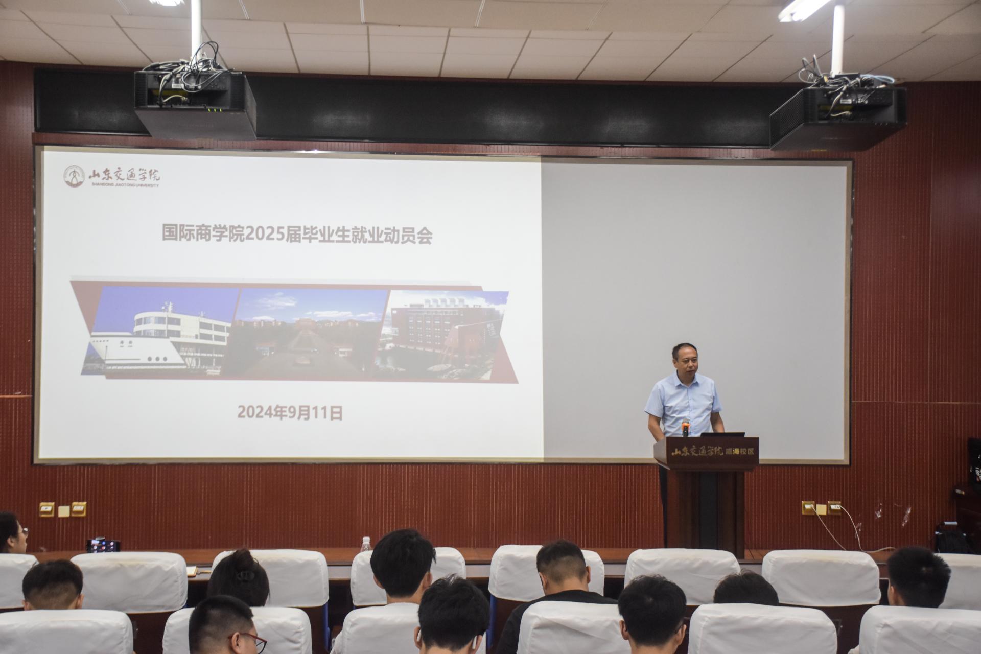 为进一步做实做细就业指导服务,全面调动起我院2025届毕业生的就业热情,9月11日,我院于威海校区第二报告厅召开2025届毕业生就业动员会。国际商学院党委书记刘佳军,党委副书记刘洋出席,2025届毕业班辅导员以及全体2025届毕业生参加此次会议。