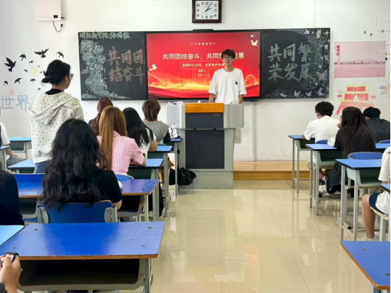活动伊始,各班团支书带领同学们系统梳理了中华民族共同体的形成和发展脉络。从历史的长河中探寻中华民族多元一体的格局演变,深入剖析国家形态结构与中华民族共同体的内在逻辑联系,使同学们对中华民族共同体有了更为全面、深入的认识,提高了同学们对民族团结重要性的理论认知水平。随后,团支书通过播放视频,带领同学们深入学习铸牢中华民族共同体意识在推动民族团结进步事业中的深远价值,进一步增强同学们维护民族团结的责任感和使命感。最后,各班同学结合学习生活实际,围绕国家意识、民族团结等相关知识展开小组讨论和互动交流。大家积极分享自己的见解和感悟,在思想的碰撞中深化了对“中华民族一家亲,同心共筑中国梦”的理解。