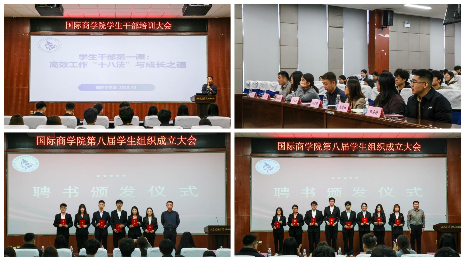 大会伊始,王旭宣读第八届学生组织负责人任命文件,各辅导员为他们颁发聘书。随后,第七届学生组织代表分享工作感悟,勉励新成员坚守服务初心,以实际行动彰显国商青年的责任担当。第八届学生组织代表作表态发言,承诺将强化思想引领,加强自身与团队建设,为学院高质量发展贡献智慧与力量。最后,单成巍以“高效工作‘十八法’与成长之道”为主题开展培训,从多维度提升学生干部自身管理能力,助力其更好履行职责,为后续工作提质增效筑牢基础。