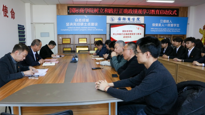 刘佳军就开展本次学习教育提出三点要求:一是筑牢思想根基。要深刻把握正确政绩观的核心要义,以坚定的理想信念筑牢政绩观根基,在创建校级党建标杆院系的进程中凸显党员干部的先锋模范作用。二是坚持实干担当,要以务实作风践行正确政绩观,戮力同心,在国际商务硕士点的建设中释放最大能量。三是坚守为民初心。要以实绩实效诠释正确政绩观,笃行致远,开拓具有国际化特色的办学新局。