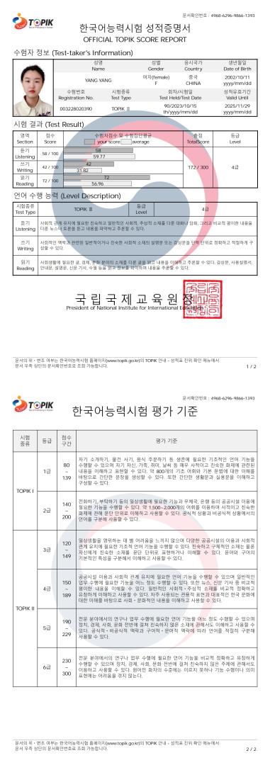 168.杨玉靓,韩国语能力考试三级