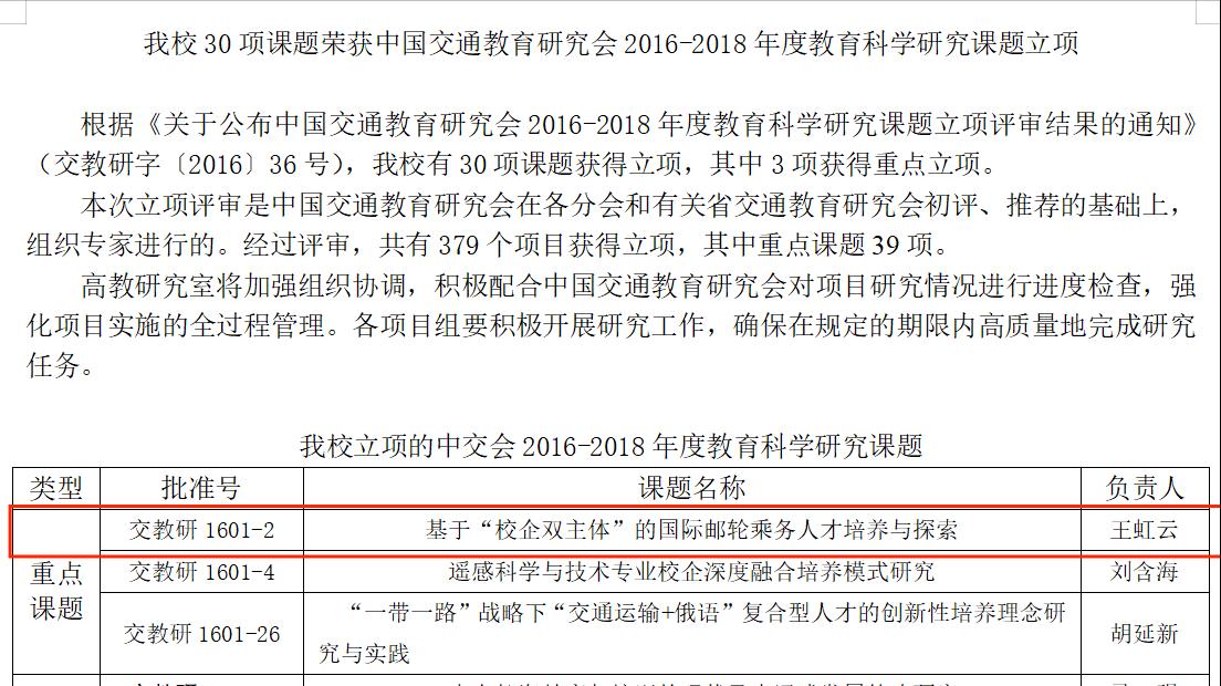 19.中国交通教育研究会教育科学研究重点课题-基于“校企双主体”的国际邮轮乘务人才培养与探索-王虹云