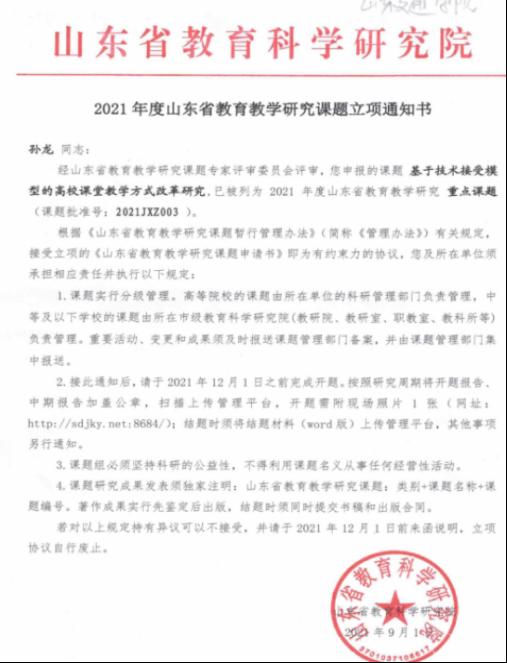 4.山东省教育教学研究课题(重点课题)-基于技术接受模型的高校课堂教学方式改革研究-孙龙