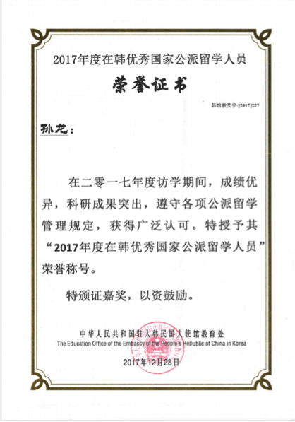 5.“在韩优秀国家公派留学人员”荣誉称号—孙龙—中华人民共和国驻大韩民国大使馆教育处