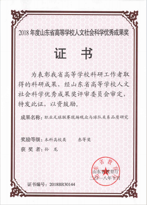1.山东省高等学校人文社会科学优秀成果奖三等奖—孙龙—山东省教育厅